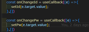 onChangeId, onChangePw는 input박스에서 입력한 value를 바인딩해주는 역할입니다.