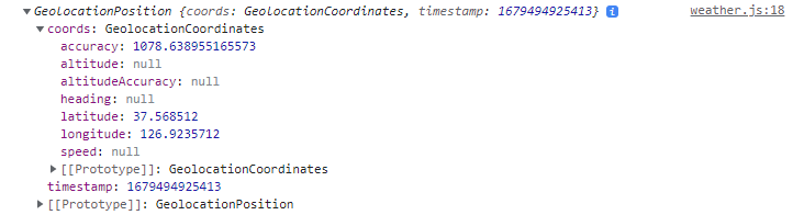 4. 다음과 같이 successCallback에 매개변수를 console.log로 찍어보면 현재 장치의 위도와 경도 값을 얻을 수 있다.