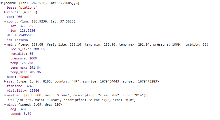 활용할 객체로는 name, main.temp, weather.description, wind.speed, wind.degree 정도 되겠다.